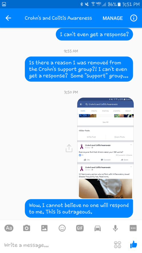 Just like that, I was no longer a member, no longer allowed in the group for a disease I share. And mind you, Crohn’s is a disease that is already difficult enough to find information about. It is a disease that no one really understands, except for those who suffer, and you cut off that life line for me. But you know all of that already.