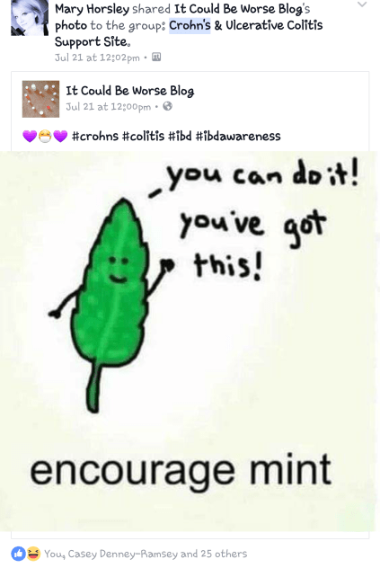 Examples of the images: These screenshots are from the other Crohn’s & UC group, but the same images were used for both. I DO NOT share my own personal blog posts. Ever.